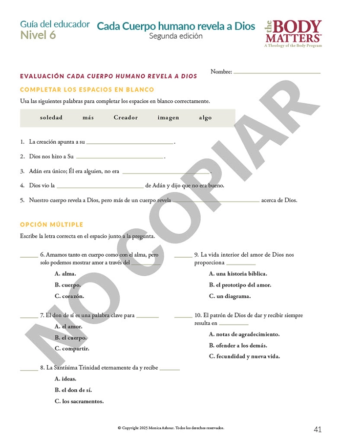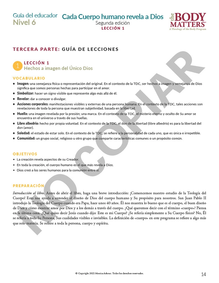 The Guía del educador is the essential teaching resource for The Body Matters program. It provides the educator detailed instructions for teaching each lesson, offers suggested enrichment activities, and includes straightforward assessments. The Guía del educador empowers the instructor to teach The Body Matters program successfully and does not assume one has any prior familiarity with Theology of the Body. Each Guía del educador includes: