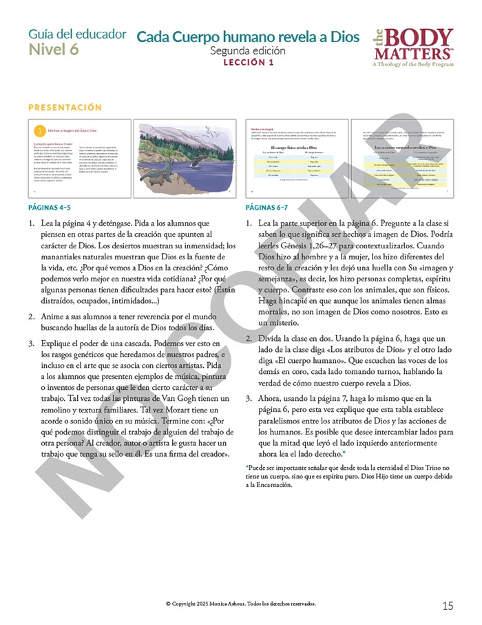 The N6-L1 guía del educador aligns with The Body Matters Nivel 6 Libro 1: Cada Cuerpo humano revela a Dios, 2nd ed.