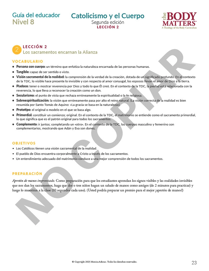 The N8-L2 guía del educador aligns with The Body Matters Nivel 8 Libro 2: Catolicismo y el Cuerpo, 2nd ed.