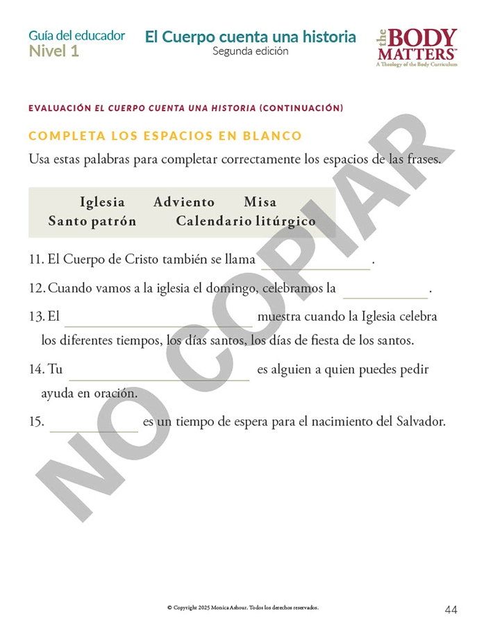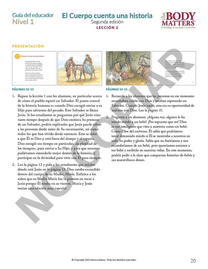 The Guía del educador is the essential teaching resource for The Body Matters program. It provides the educator detailed instructions for teaching each lesson, offers suggested enrichment activities, and includes straightforward assessments. The Guía del educador empowers the instructor to teach The Body Matters program successfully and does not assume one has any prior familiarity with Theology of the Body. Each Guía del educador includes: