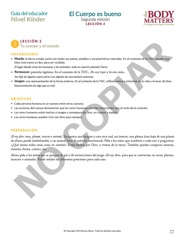 The NK-L2 guía del educador aligns with The Body Matters Nivel Kínder Libro 2: El Cuerpo es bueno, 2nd ed.