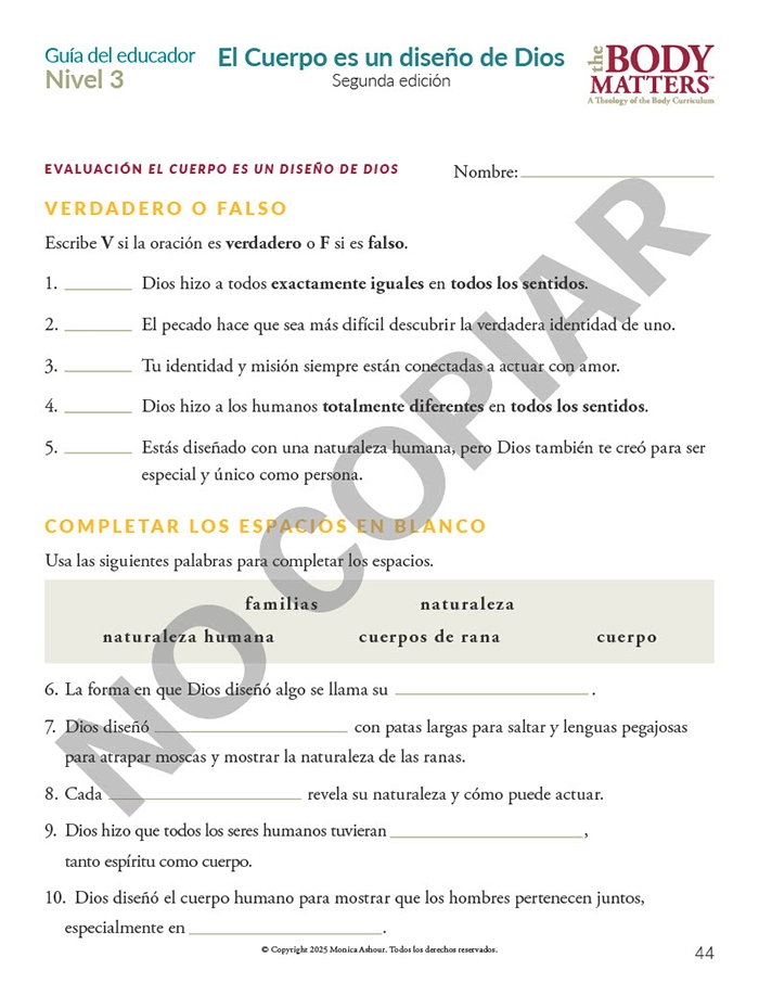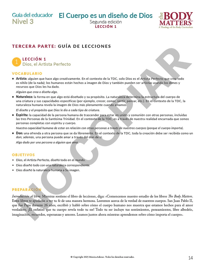 The Guía del educador is the essential teaching resource for The Body Matters program. It provides the educator detailed instructions for teaching each lesson, offers suggested enrichment activities, and includes straightforward assessments. The Guía del educador empowers the instructor to teach The Body Matters program successfully and does not assume one has any prior familiarity with Theology of the Body. Each Guía del educador includes: