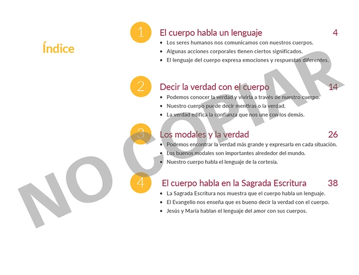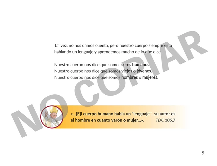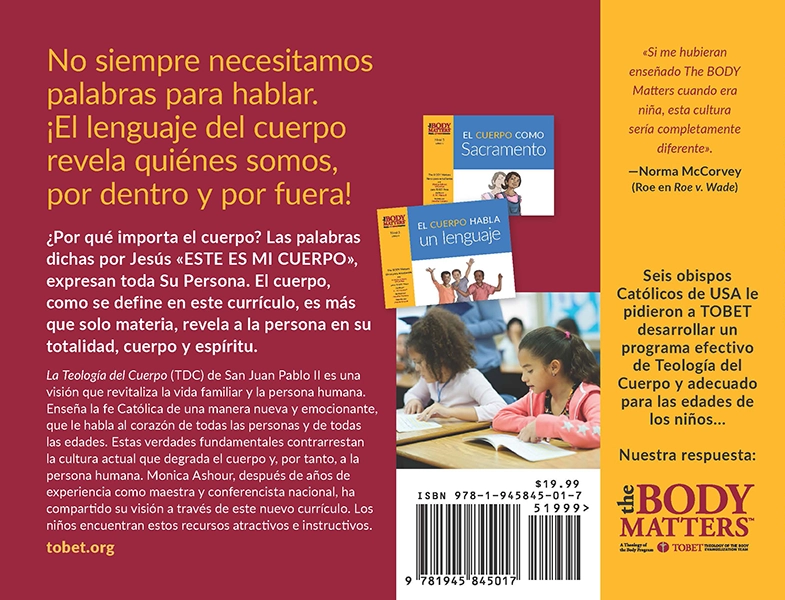 The actions of the body communicate like words do, and the body conveys truths, even through a handshake or a smile. However, the body can also convey falsehoods, as when Judas betrayed Jesus with a kiss. Children learn that manners show kindness and respect with bodily actions. Scripture reveals the fullness of the language of the body through the lives of Jesus and Mary. La Teología del Cuerpo es un enfoque completo y hermoso de la verdad del cuerpo y su significado. En una cultura donde el cuerpo es considerado «enemigo de la libertad», la Teología del Cuerpo de San Juan Pablo II es más necesaria que nunca. La serie de libros de lecciones The Body Matters enseña las verdades sobre el cuerpo de una manera accesible y apropiada para la edad. Es un gran recurso para los padres, los programas de formación en la fe y las escuelas católicas, para ayudar a los niños a ver la santidad del cuerpo. Aquí se pueden encontrar las enseñanzas de San Juan Pablo II sobre el cuerpo en un lenguaje accesible para los niños, con hermosas ilustraciones, ejemplos prácticos y una sólida teología católica. Precios especiales para set de libros y guías para educadores disponibles para escuelas y programas de formación en la fe. Llámenos al 972-395-5593 o al número gratuito 888-855-4791.