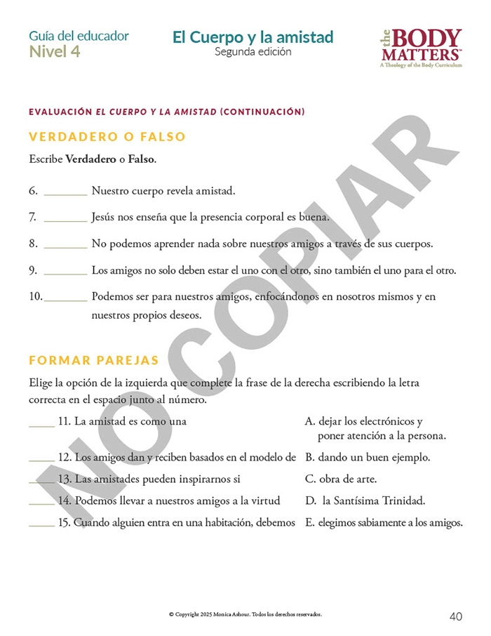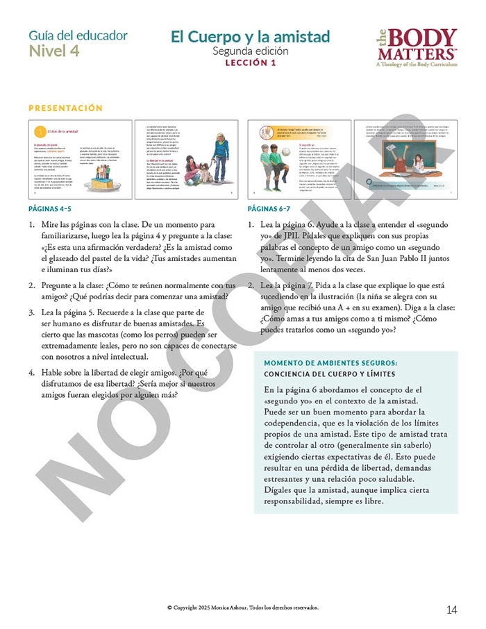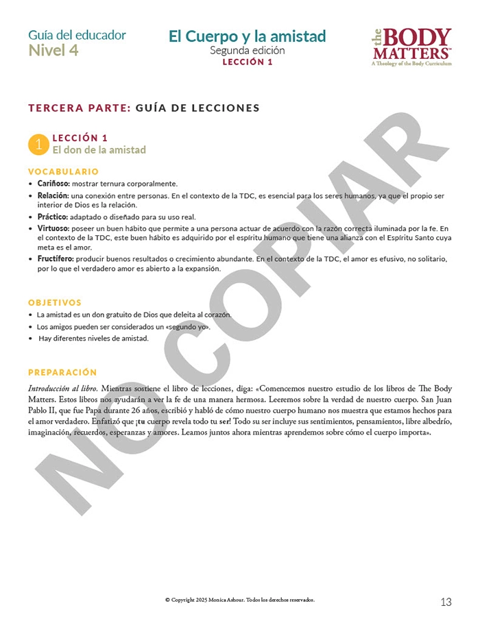 The Guía del educador is the essential teaching resource for The Body Matters program. It provides the educator detailed instructions for teaching each lesson, offers suggested enrichment activities, and includes straightforward assessments. The Guía del educador empowers the instructor to teach The Body Matters program successfully and does not assume one has any prior familiarity with Theology of the Body. Each Guía del educador includes: