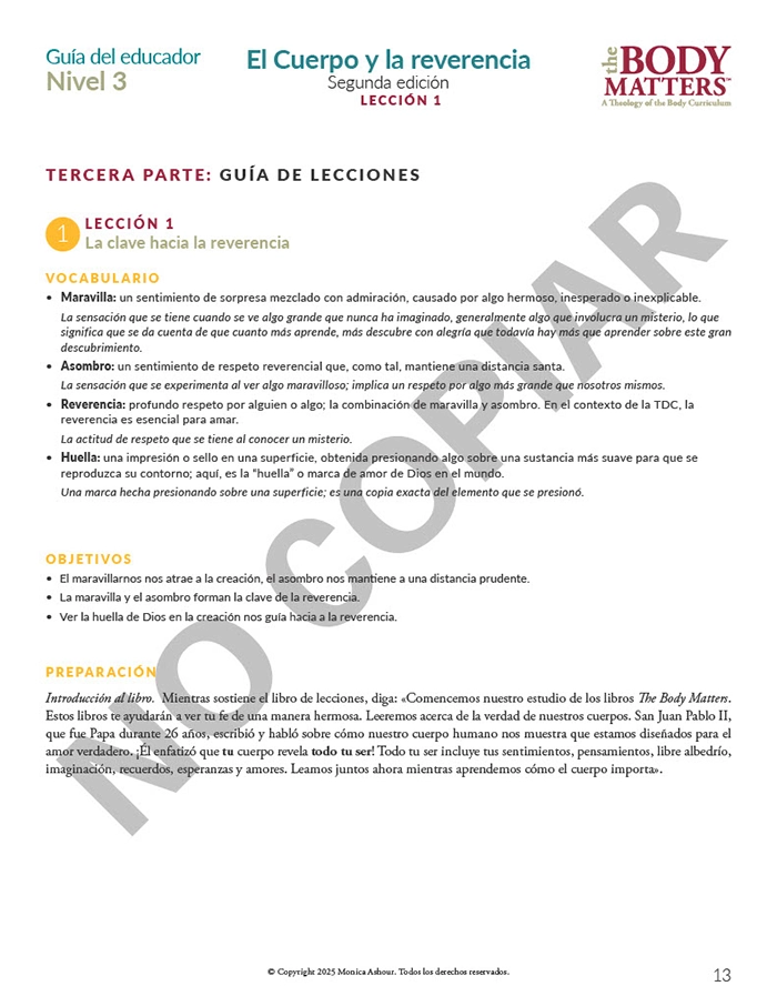 The Guía del educador is the essential teaching resource for The Body Matters program. It provides the educator detailed instructions for teaching each lesson, offers suggested enrichment activities, and includes straightforward assessments. The Guía del educador empowers the instructor to teach The Body Matters program successfully and does not assume one has any prior familiarity with Theology of the Body. Each Guía del educador includes: