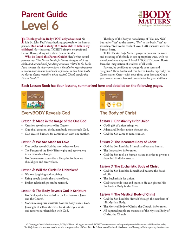 TOBET is pleased to announce the release of our new Parent Guides which are to be used in conjunction with each of our lesson books for the Pre-K— Level 8 program known as The Body Matters. To be used for family catechesis or in conjunction with Faith Formation and/or Catholic schools or homeschool, these guides will equip parents in discussing various topics with their children. The Parent Guides spell out the three objectives and central goal of each lesson so that parents are confident regarding the content of the book. Furthermore, they encourage parents to share their own fun, interesting stories with their children to enhance connection and encourage regular discussion. Each Parent Guide also includes suggested topics to facilitate dialogue with their children. Finally, it offers fun activities or recommended prayers that parents can present to their children (from pre-school to middle school). These easy to download digital PDFs are brief, only a few pages, so they’re easy to use for even the busiest parent. For parents who would like to go into more details regarding The Body Matters lesson books, TOBET’s robust Educator Guides serve that purpose very well. Especially during this moment in history, whereby challenges are made to the child’s very identity regarding gender, The Body Matters books, along with Parent Guides, are of the upmost significance. For more information, click here.