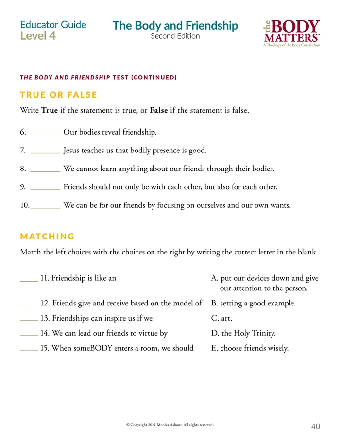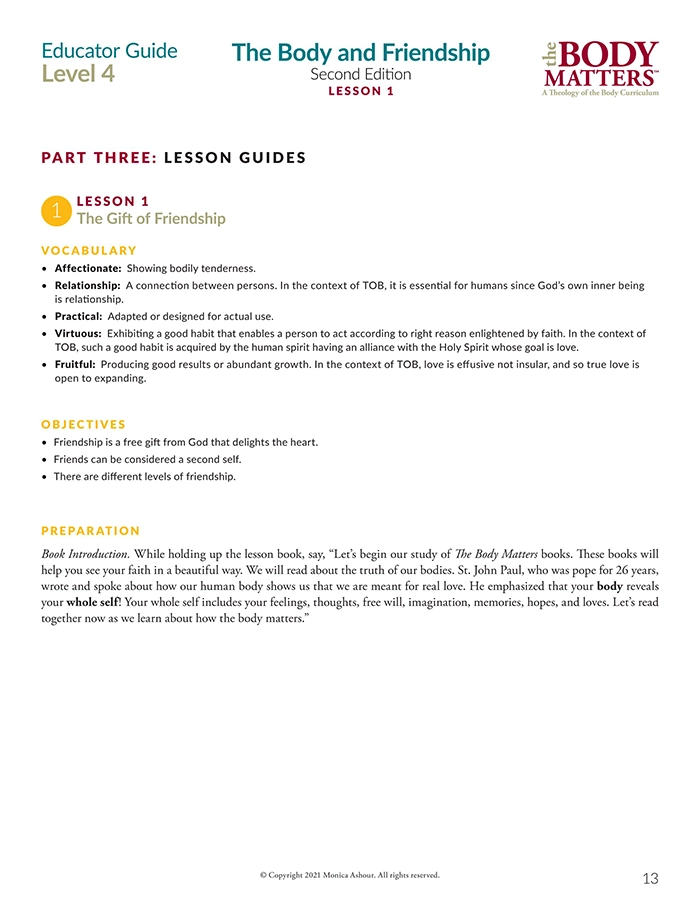 The Educator Guide is the essential teaching resource for The Body Matters program. It provides the educator detailed instructions for teaching each lesson, offers suggested enrichment activities, and includes straight-forward assessments. The Educator Guide empowers the instructor to teach The Body Matters program successfully and does not assume one has any prior familiarity with Theology of the Body. Each Educator Guide includes: