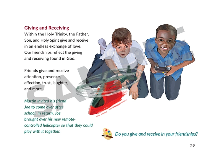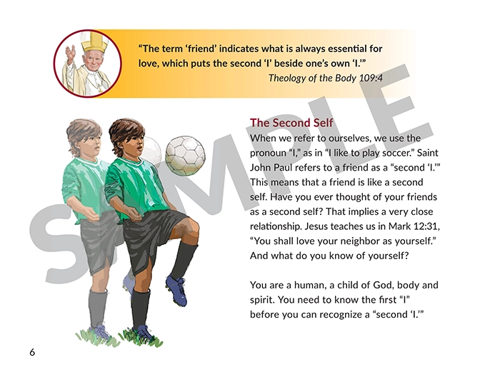 This book teaches how friendships are the icing on the cake of life. There are different levels of friendship. Children learn to approach friendships as gifts to enjoy. They learn to be “for” another person, interested in the good of the other person. Good human friendships mirror the friendship we have with Jesus. The Theology of the Body is a positive, beautiful approach to the truth of the body and its meaning. In a culture where the body is considered “an enemy to freedom,” Saint John Paul’s Theology of the Body is necessary more than ever. The Body Matters lesson books series teaches the truths about the body in an accessible, age-appropriate way. It is a great resource for parents, Faith Formation programs and Catholic schools to help children see the sacredness of the body. Here you can find Saint John Paul’s teachings on the body rendered in language accessible to children, with beautiful illustrations, practical examples and solid Catholic theology. Special pricing for book sets and educator guides available for schools and faith formation programs. Please call us at 972-395-5593, or toll free at 888-855-4791.
