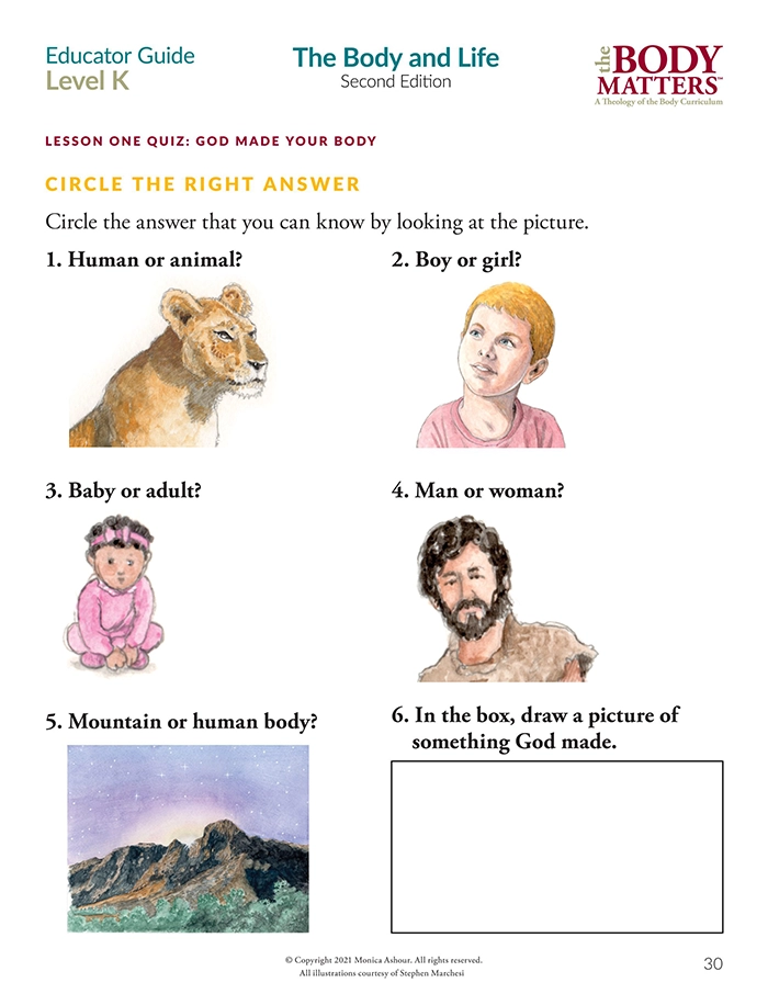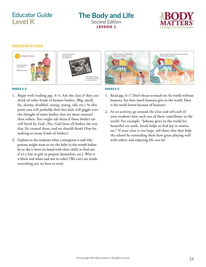 The Educator Guide is the essential teaching resource for The Body Matters program. It provides the educator detailed instructions for teaching each lesson, offers suggested enrichment activities, and includes straight-forward assessments. The Educator Guide empowers the instructor to teach The Body Matters program successfully and does not assume one has any prior familiarity with Theology of the Body. Each Educator Guide includes: