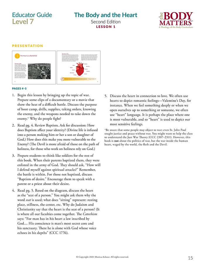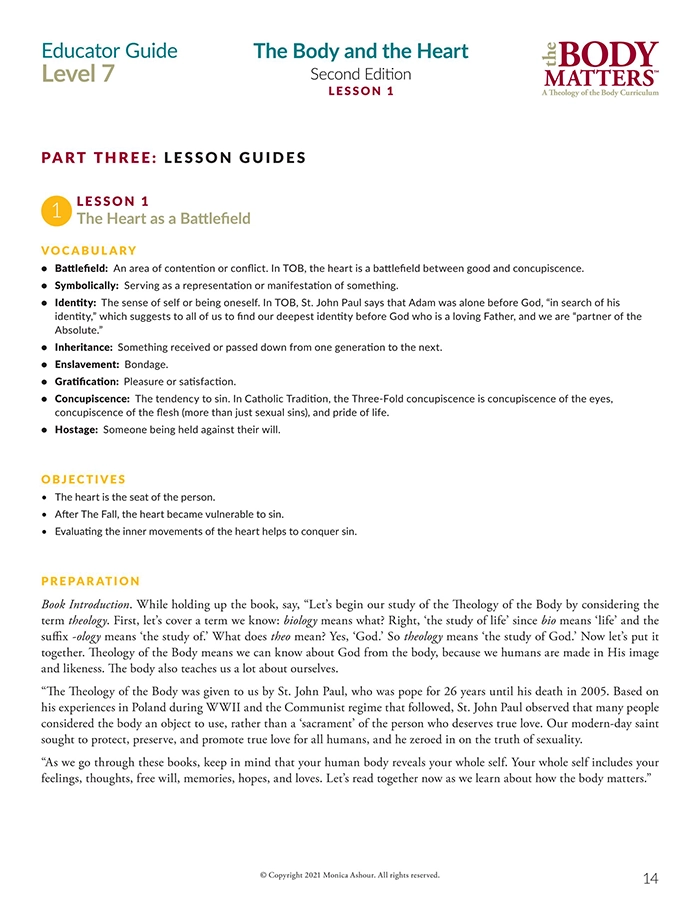 The Educator Guide is the essential teaching resource for The Body Matters program. It provides the educator detailed instructions for teaching each lesson, offers suggested enrichment activities, and includes straight-forward assessments. The Educator Guide empowers the instructor to teach The Body Matters program successfully and does not assume one has any prior familiarity with Theology of the Body. Each Educator Guide includes: