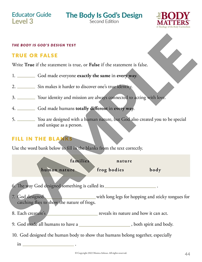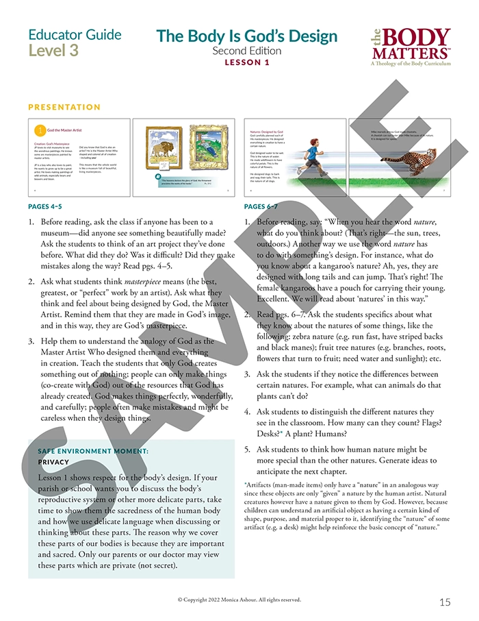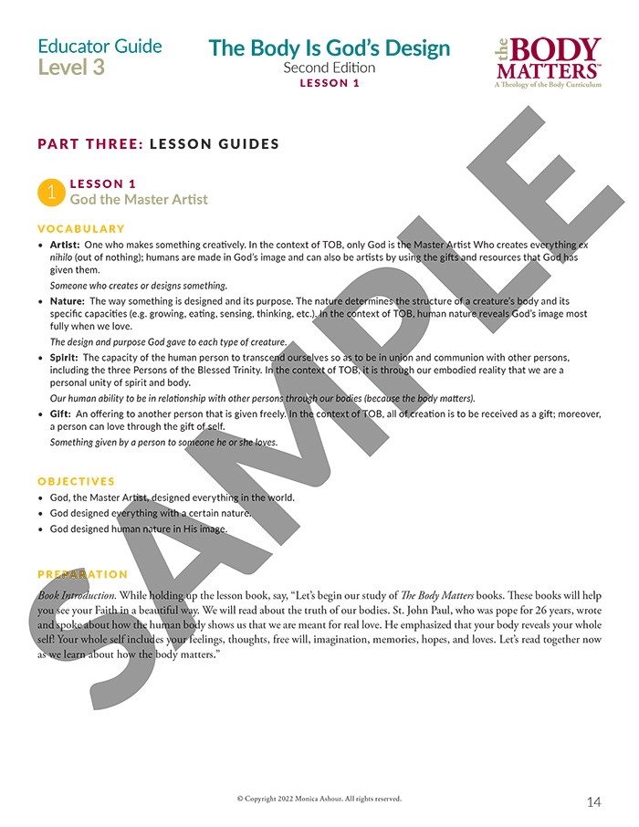 The Educator Guide is the essential teaching resource for The Body Matters program. It provides the educator detailed instructions for teaching each lesson, offers suggested enrichment activities, and includes straight-forward assessments. The Educator Guide empowers the instructor to teach The Body Matters program successfully and does not assume one has any prior familiarity with Theology of the Body. Each Educator Guide includes: