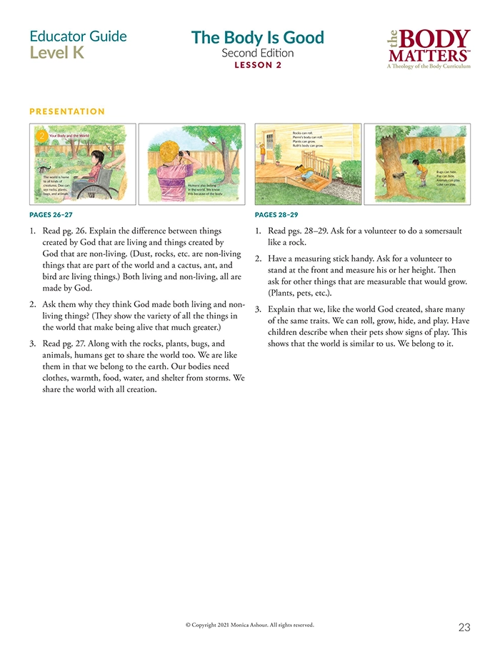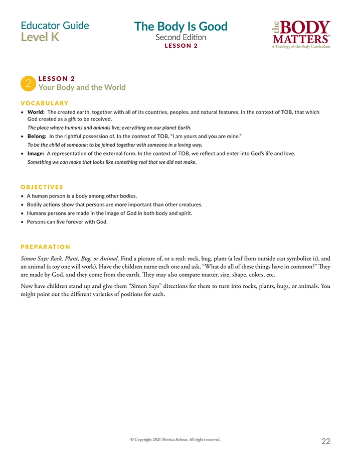 The LK-B2 Educator Guide aligns with The Body Matters Level K Lesson Book 2: The Body is Good, 2nd ed.