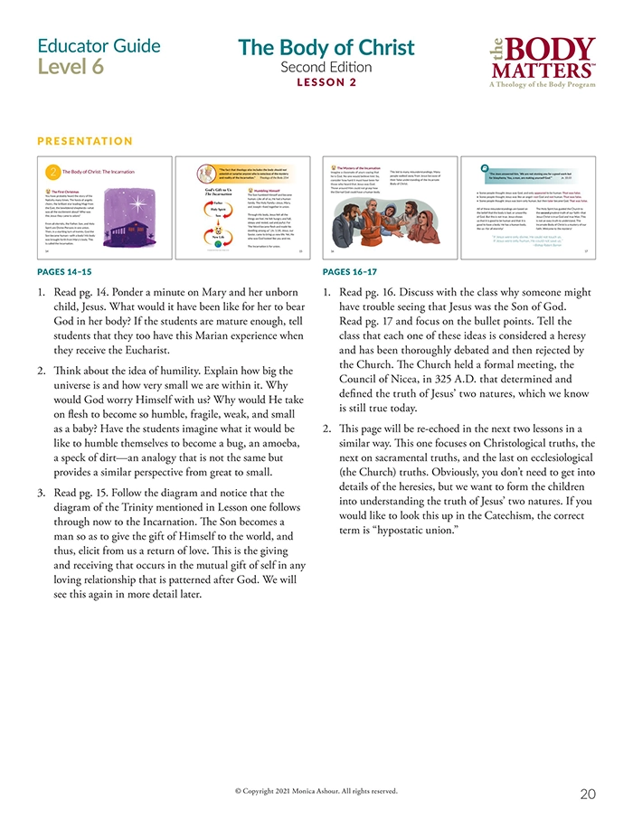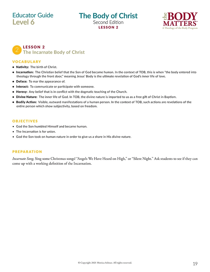 The Educator Guide is the essential teaching resource for The Body Matters program. It provides the educator detailed instructions for teaching each lesson, offers suggested enrichment activities, and includes straight-forward assessments. The Educator Guide empowers the instructor to teach The Body Matters program successfully and does not assume one has any prior familiarity with Theology of the Body. Each Educator Guide includes: