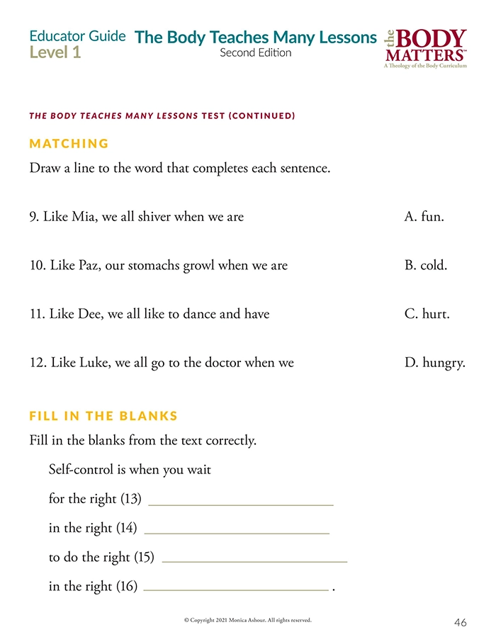 The Educator Guide is the essential teaching resource for The Body Matters program. It provides the educator detailed instructions for teaching each lesson, offers suggested enrichment activities, and includes straight-forward assessments. The Educator Guide empowers the instructor to teach The Body Matters program successfully and does not assume one has any prior familiarity with Theology of the Body. Each Educator Guide includes: